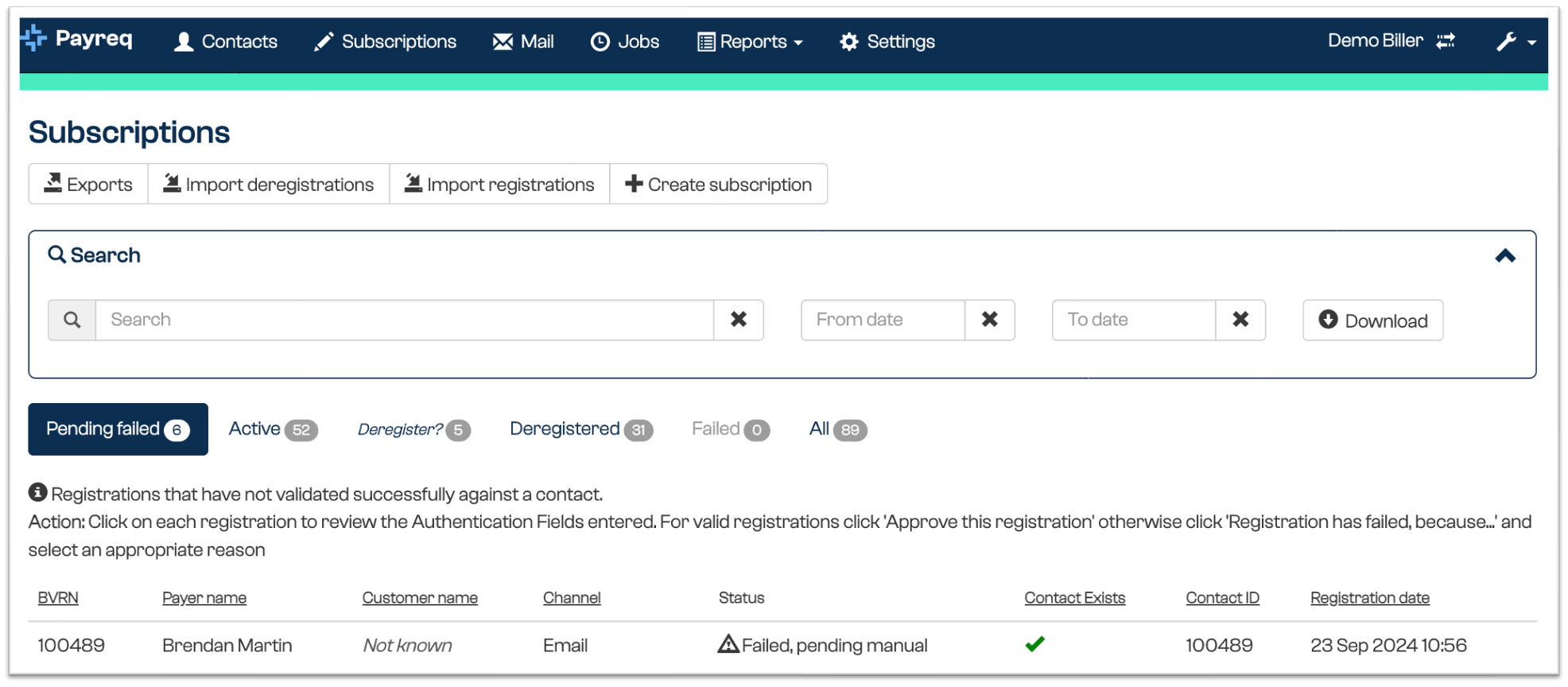 When a customer attempts to register for digital delivery (e.g. BPAY View or Smart Mailbox), Payreq tries to automatically match their subscription request against the contact data you’ve uploaded.